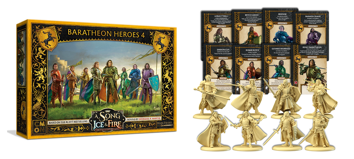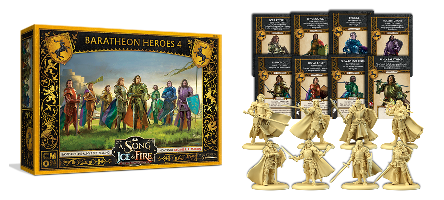 Baratheon Heroes #4 gives House Baratheon players in the A Song of Ice and Fire: Tabletop Miniatures Game a set of characters loyal to King Renly for their forces. Renly, himself, heads into battle on the front lines, while others like Ser Parmen Crane, Brienne of Tarth, and Ser Guvard Morrigen do what they can to see the younger Baratheon brother on the Iron Throne.
